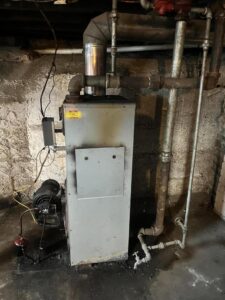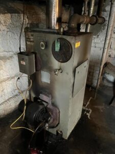 Additional features include a metal roof, vinyl siding, hot water radiators, and a large laundry and utility room on the main level. The property also offers public water and sewer, fiber optic internet service, attic storage, and new carpet in the bedrooms.